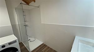 Salle d’eau avec douche à l’italienne, meuble avec vasque, miroir, lave-linge