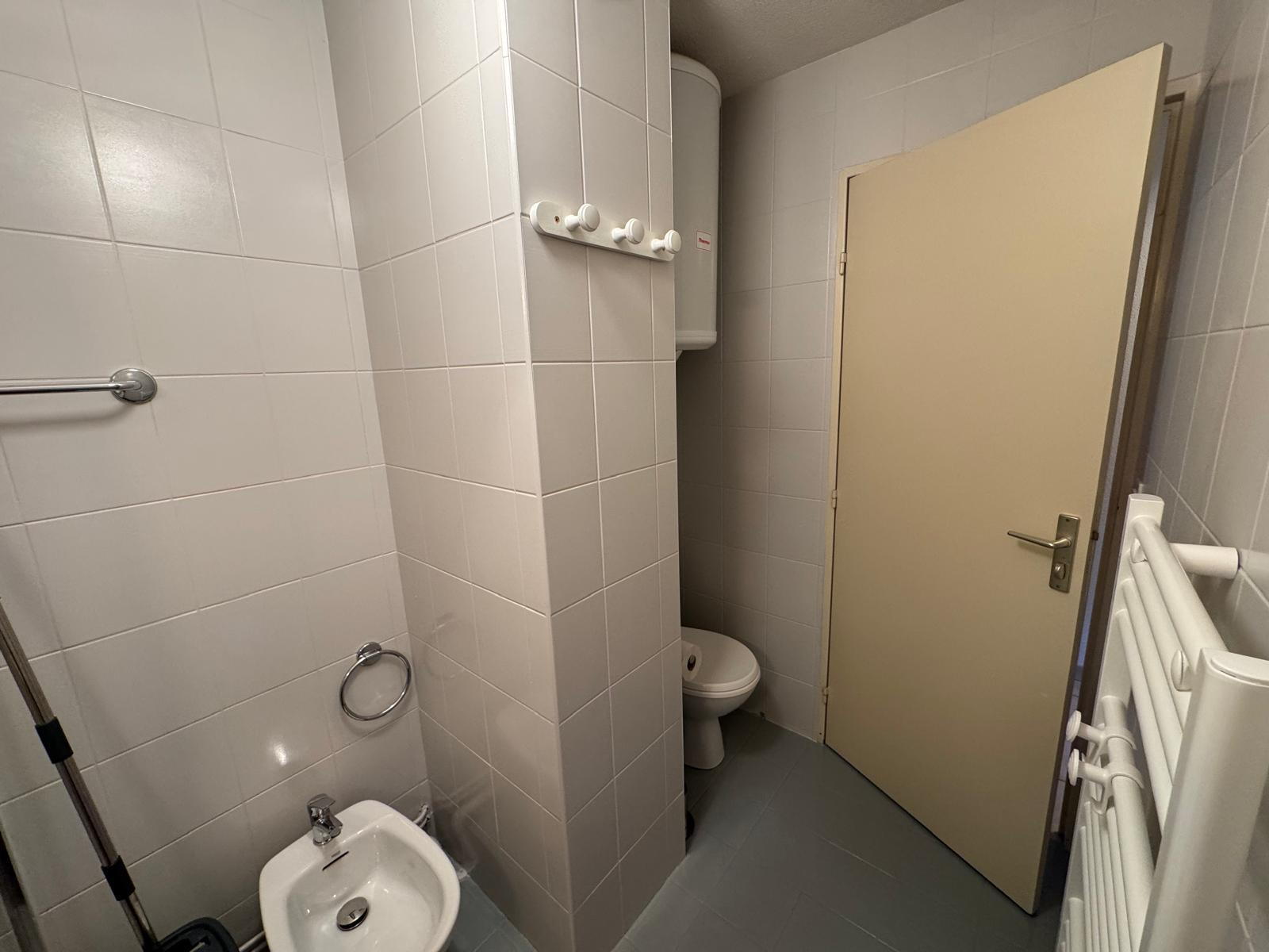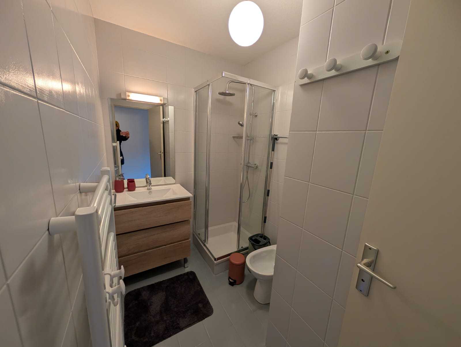 Salle d'eau : Cabine douche, WC (en renfoncement), bidet, meuble avec vasque, seche-serviettes électrique mural.